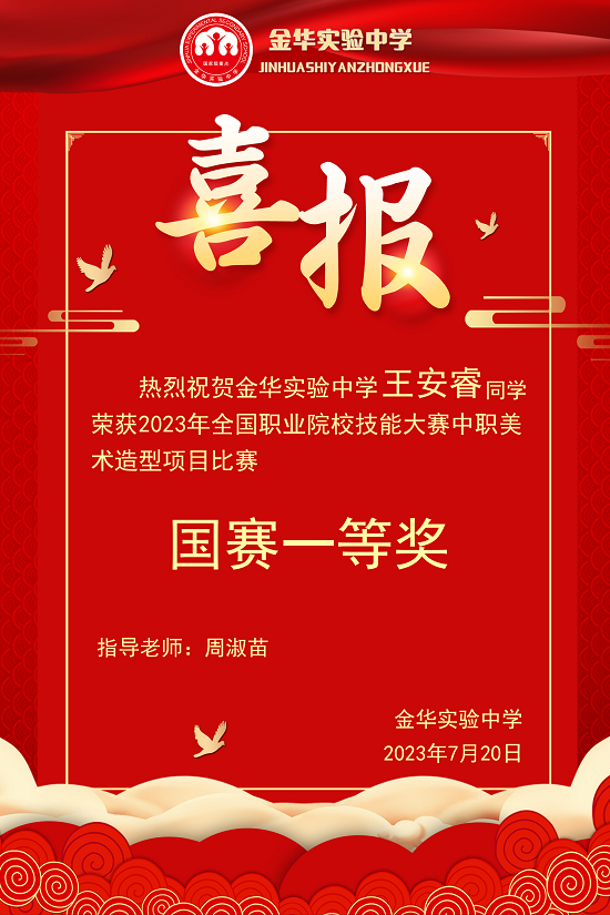 7月20日,金华实验中学工美2101班王安睿同学荣获2023年全国职业院校技能大赛中职美术造型项目比赛一等奖,这是该校学生在全国技能大赛上的新突破。