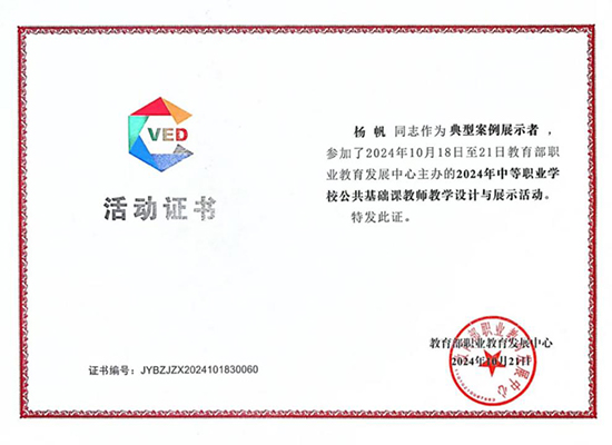 厚积薄发,笃行致远。10月19日,由教育部职业教育发展中心主办的2024年全国中等职业学校公共基础教师教学设计与展示活动在西安圆满结束。柳市职业技术学校杨帆老师历经多轮激烈选拔,凭借其卓越的教学能力和出色的表现,在体育与健康组中脱颖而出,荣获全国一等奖。并作为浙江省唯一代表,在活动中进行了精彩的案例展示,其参赛作品成功入选全国中等职业学校教师教学设计典型示范性案例,将由高教社出版,向全国推广。