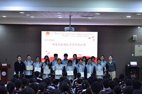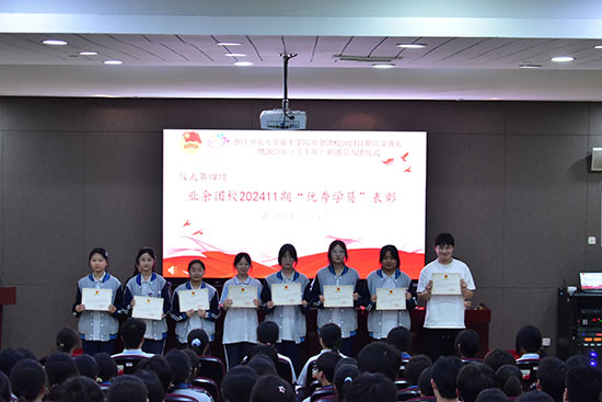 校党委委员、德育分管院长唐瑛为业余团校202411期优秀学员代表颁发证书,并合影留念。