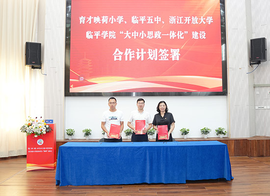 启动仪式上浙江开放大学临平学院、临平第五中学、育才映荷小学主要负责人共同签署《大中小思政一体化建设合作计划》,标志着三校跨学段协同育人机制进入实质性推进阶段。