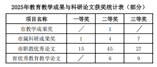 成果评优与案例引领同步突破:成果评优中,获市教学成果奖二等奖1项、市属级教育科学研究优秀成果12项。案例评选中,获中国民办教育协会优秀案例2项,省级中职教育改革优秀典型案例1项,市级教育改革优秀典型案例1项、典型案例1项,“嘉禾职教·可见教研”优秀案例4项、典型案例2项。论文评选方面,市职教优秀论文获奖86篇,获奖率超90%;省优秀教育教学论文获奖15篇。