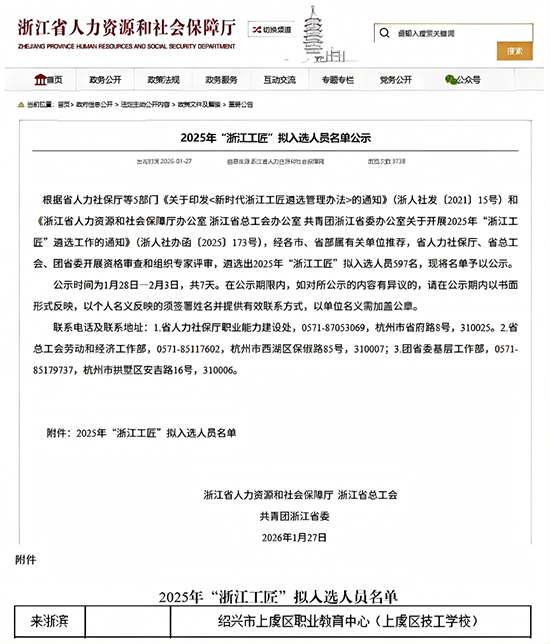 近日,浙江省人力资源和社会保障厅、省总工会、共青团浙江省委联合公布2025年“浙江工匠”入选人员名单,上虞区职业教育中心来浙滨老师历经层层选拔,脱颖而出,为学校再添一位“浙江工匠”。