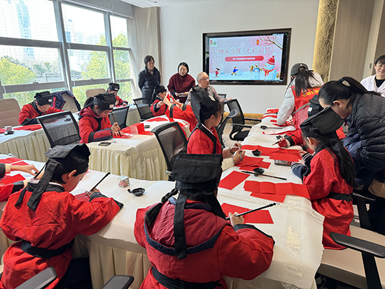 了解了厚重的中医药文化,活动进入了轻松而充满创造性的“笔墨迎春”环节。长桌铺展,红纸笔墨备齐,青少年们执笔挥毫,将刚在汲取的文化灵感注入对联与“福”字的创作中。不再是千篇一律的吉祥话,一副副别出心裁的春联跃然纸上:有的巧妙嵌入中药名称,寓意深远;有的将健康祝愿化为雅词对仗,别具一格。一个个“福”字更是创意无限,有的笔画间仿佛勾勒出草药形态,有的整体设计蕴含平衡和谐的养生理念。活动现场温情满满。家长们不再是旁观者,而是与孩子一起讨论对联内容,帮忙压纸研墨;大学生志愿者们则穿梭其间,指导握笔姿势,讲解平仄韵律。一位父亲拿着孩子写的“药香除旧岁,银针迎新春”对联,拍照分享到朋友圈:“这是孩子最特别的新年礼物。”