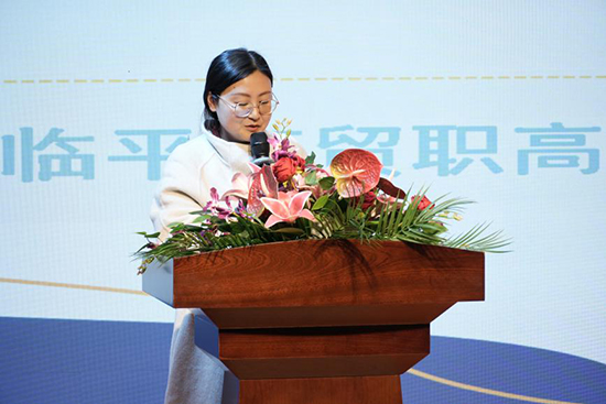 旅服232班的邝益晴同学代表全体学生发言,她由衷感谢老师的悉心栽培,感谢学校和企业给予锻炼的机会。她表示会以谦逊之心认真学习,以务实的精神踏实做事,牢记双重身份,在岗位上发光发热!