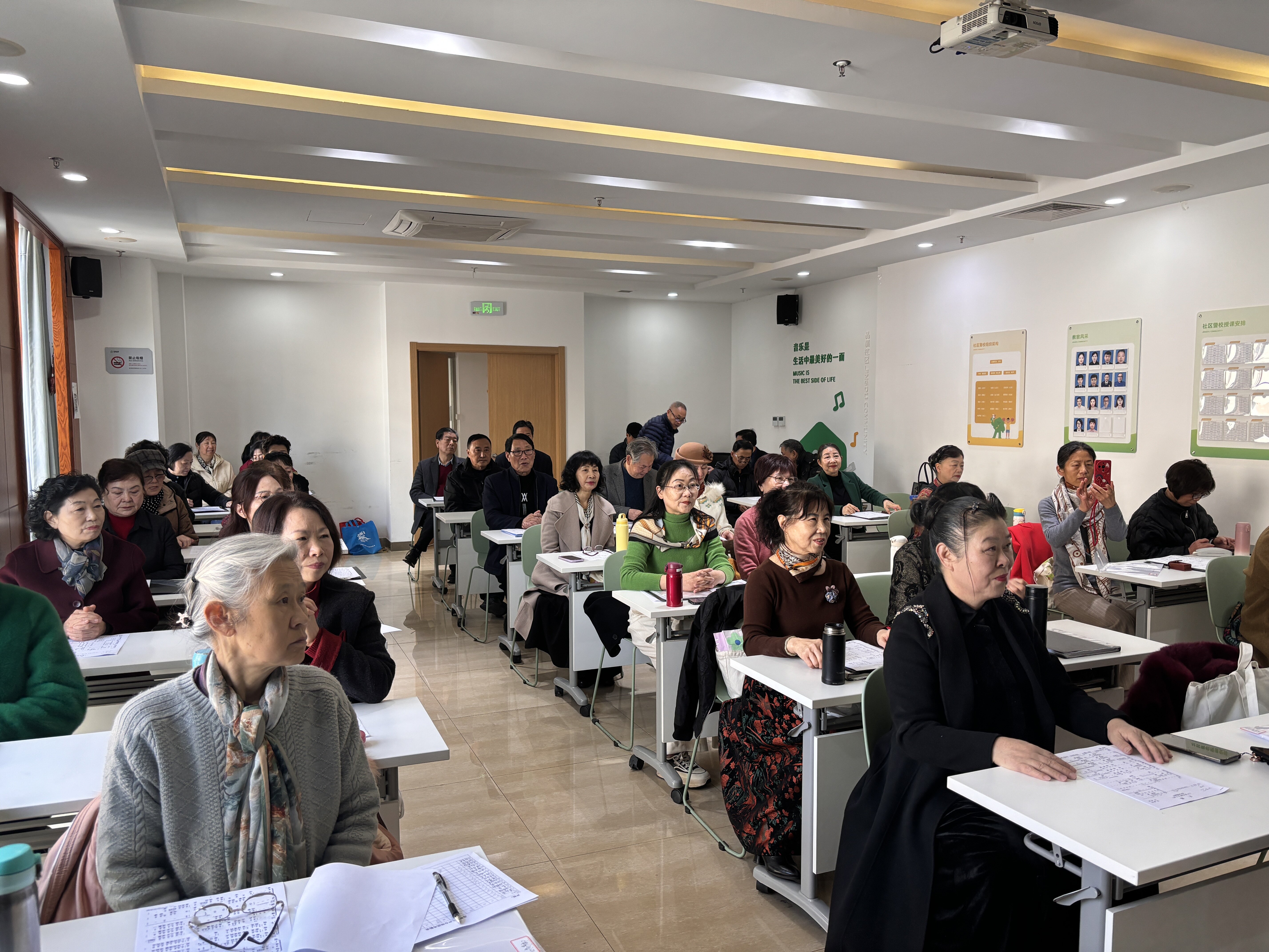 课堂上,肖老师由浅入深,讲解发声方法、乐理知识及演唱技巧,尤其细致地为大家讲述发声练习在歌唱中的重要性,集体发声练习和个体发声等内容。他指导大家通过呼气、吸气来练习声乐基本功,激发了学员们的学唱热情。大家通过练习一首欢快的短曲掌握了歌唱练习中呼吸的正确控制,学员与老师一起练习发声技巧。学员在教师示范下,学习发声技巧,掌握丹田运气,胸腔共鸣,一个个俨然是音乐学院的学员。随后,他们和着优美的旋律,充满激情地歌唱,陶醉于美妙的音乐声中。