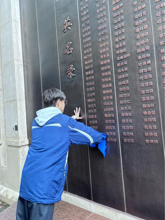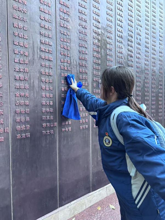 活动最后,同学们开展了“我为英雄擦墓碑”红色志愿服务。大家手持毛巾,认真擦拭烈士墓碑,清理周围环境,用实际行动表达对革命先烈的敬仰与感恩。一块块被擦拭得干净整洁的墓碑,承载着新时代青年对英雄的深切缅怀。